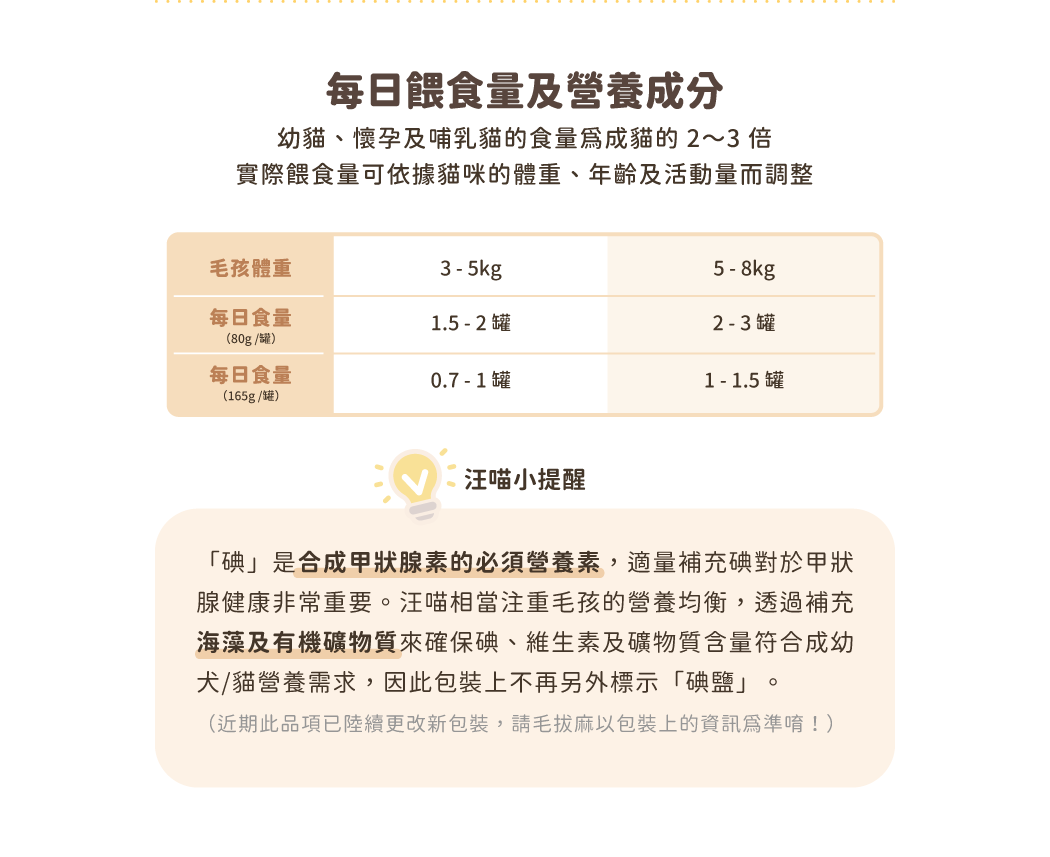 • 幼猫、怀孕及哺乳猫的食量为成猫食量的2~3倍